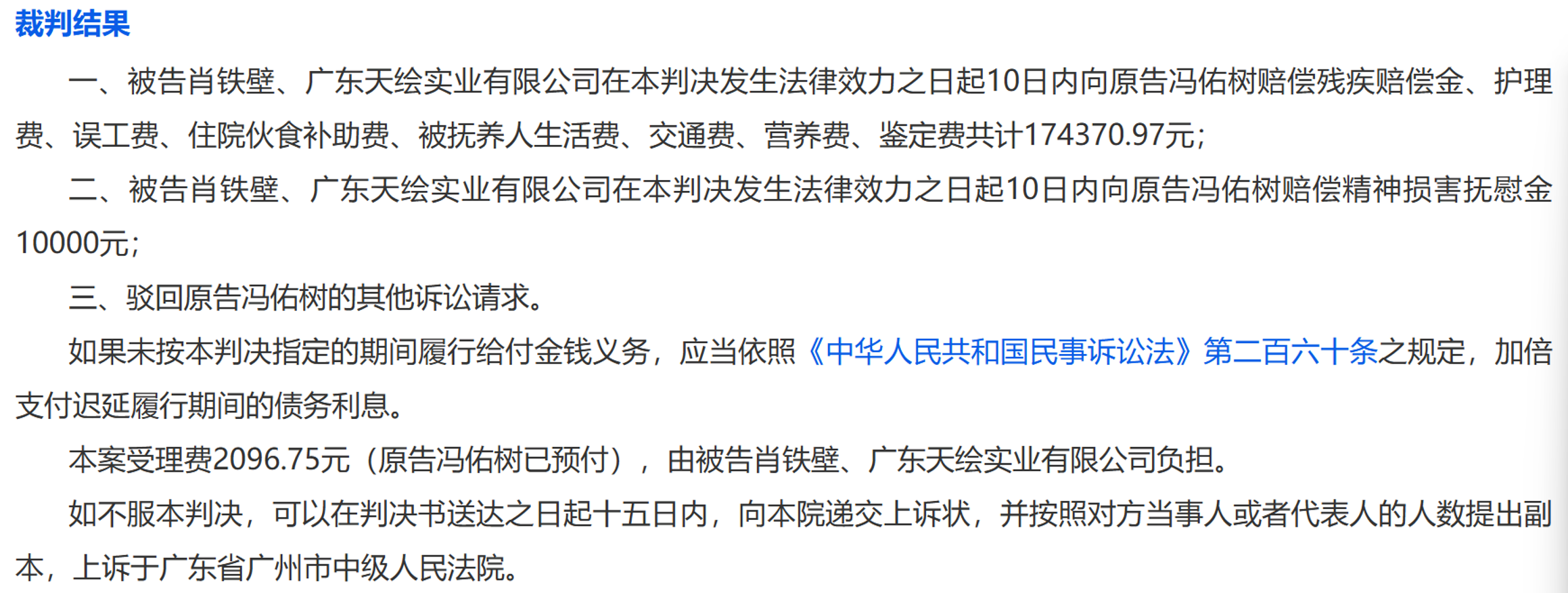 被告肖某壁、广东天某实业有限公司于判决生效之日起10日内赔偿原告冯某树残疾赔偿金96236元、护理费3660元、误工费16595元、住院伙食补助费200元、被抚养人生活费53477.97元、交通费300元、营养费500元、鉴定费3402元,合计174370.97元;并赔偿精神损害抚慰金10000元;驳回原告其他诉讼请求。